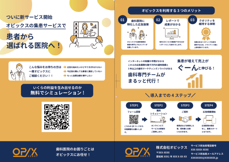 概要:歯科医院を経営している40〜60代向けに集患支援サービスとして広告代行を提供するため、誠実性を与えながらも、革新的なサービスの印象を与えるため、明るめのオレンジ色を採用しました。