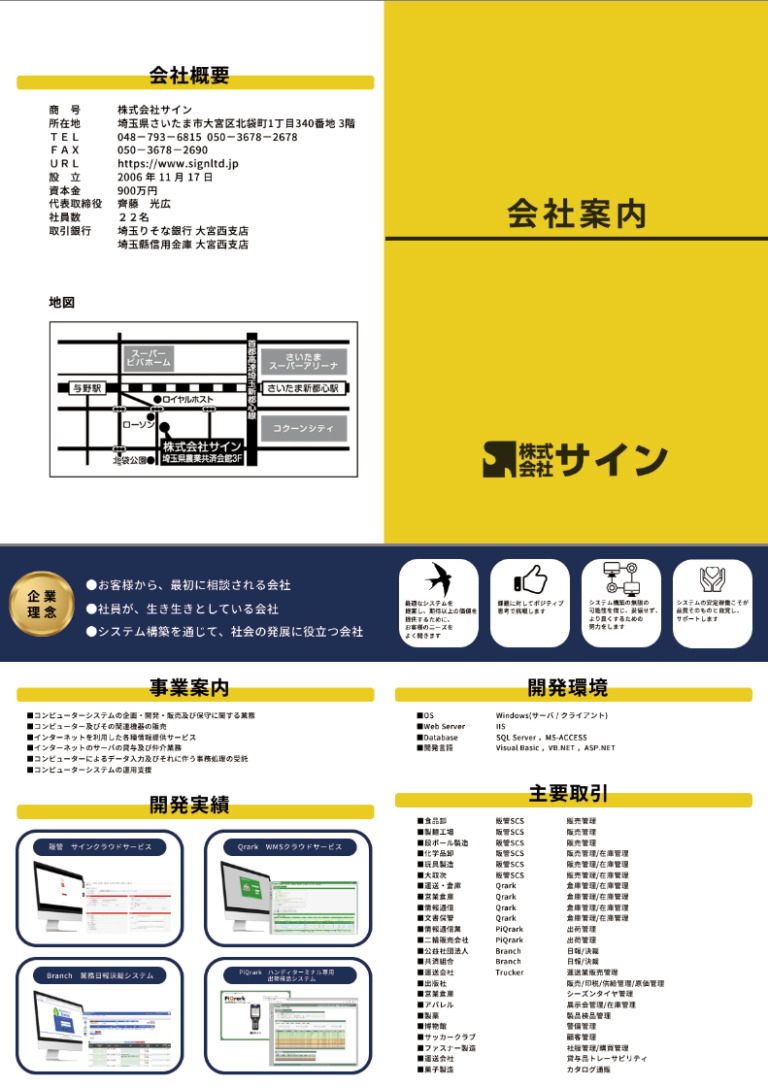 ターゲット層:法人のシステム担当者様に対応する企業経営者概要: 営業活動で使用する、会社案内用のパンフレットデザインを作成しました。担当範囲: デザイン構成設計 / デザイン制作 ポイント:企業イメージである誠実性を保ちながら、明るさを高めるため黄色を基調としたシンプルなデザインとしました。